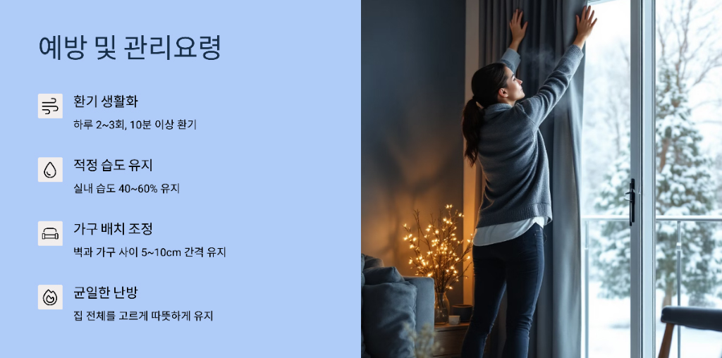 - 난방 방법 주의 국부적인 난방(히터를 한 지점만 강하게 틀기)보다는 집 전체를 고르게 따뜻하게 데우는 것이 결로 예방에 효과적입니다.